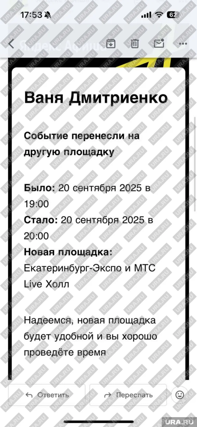 «Событие перенесли на другую площадку — „Екатеринбург-ЭКСПО“ и „МТС Live Холл“. Надеемся, новая площадка будет удобной и вы хорошо проведете время», — говорится в сообщении, которое пришло читателю URA.RU.