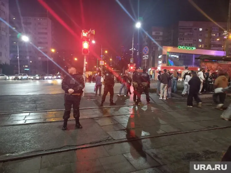 21:44 Толпа на трамвайной остановке у «Радуги Парка». Возле остановки дежурят народные дружинники.