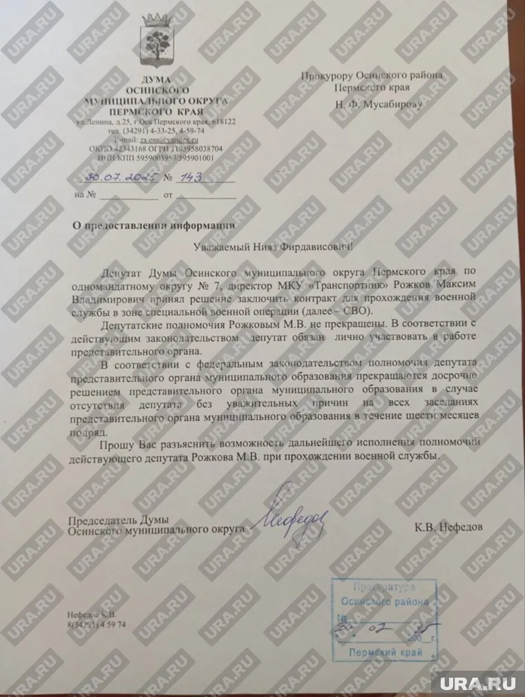 Спикер Осинской думы Константин Нефедов обратился к местному прокурору Ниязу Мусабирову по поводу отправившегося на СВО депутата и директора МКУ «Транспортник» Максим Рожкова. Нефедова смущает, что Рожкова полгода не будет на заседании, а по закону это основание для отстранения. Письмо на имя прокурора есть в распоряжении URA.RU.