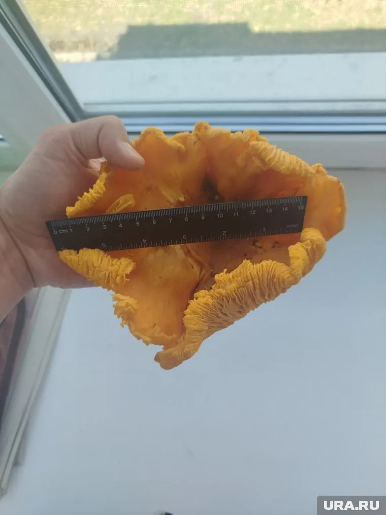 «Найдена Царица-лисица, 20 сантиметров, полевское направление», — поделился свердловчанин в сообществе «Дары лесов Урала. Грибы Екатеринбурга и области» в соцсети «ВКонтакте». На фотографии для сравнения на шляпке гриба расположена 15 сантиметровая линейка.