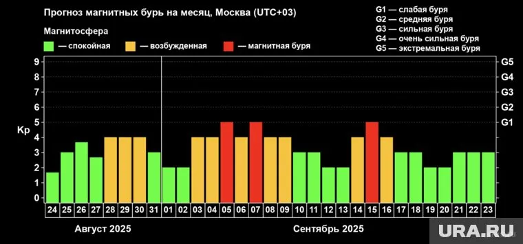 Согласно графику ученых, к концу августа магнитосфера в целом сохранит стабильность. Лишь в период с 28 по 30 сентября возможна повышенная геомагнитная активность. Однако уже в начале сентября метеозависимым стоит готовиться к магнитному шторму: