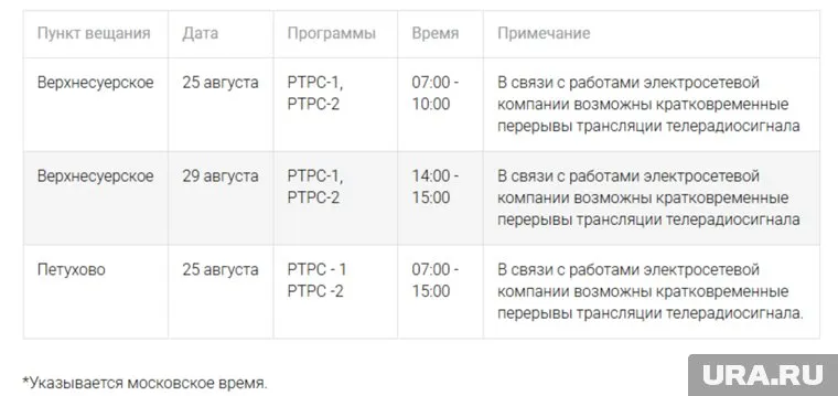 Аналогичные кратковременные отключения телерадиосигнала уже неоднократно проводились в Курганской области: ранее перерывы в трансляции были зафиксированы с 4 по 10 августа в Косолапово, Петухово и Шатрово, а также с 28 июля по 3 августа — в Макушино и Сарт-Абдрашево. Причиной подобных перебоев традиционно становятся плановые профилактические работы на передающих станциях.