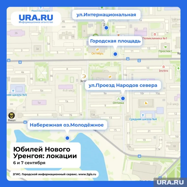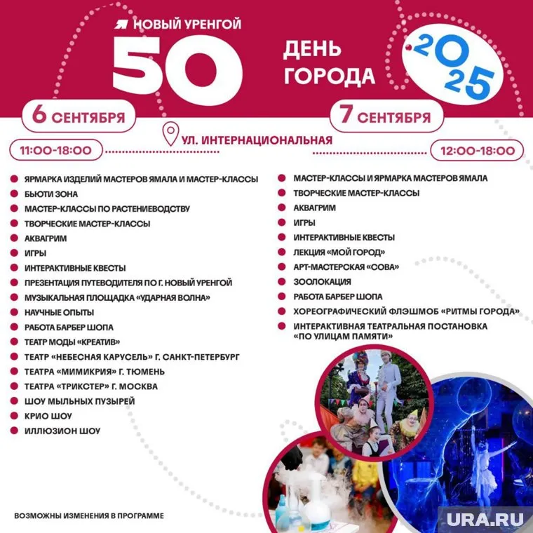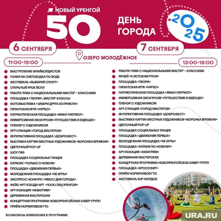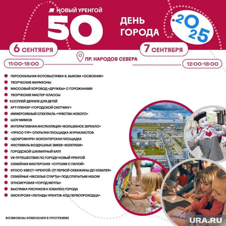 В Новом Уренгое (ЯНАО) завершается подготовка к празднованию 50-летнего юбилея. Мероприятия готовились несколько лет — еще летом 2022 года президент России Владимир Путин подписал указ о начале подготовки к Дню города. Подробнее о мероприятиях 6 и 7 сентября — в афише URA.RU.