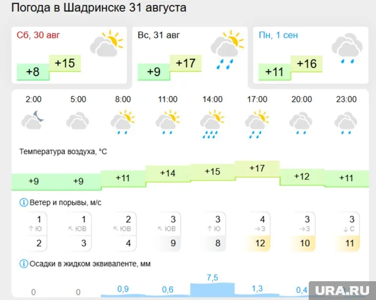«В воскресенье в Шадринске облачно, дождь. Температура днем составит 17 градусов, вечером 12. Сильные порывы ветра до 12 м/с», — написано на сайте Gismeteo. Сильный дождь возможен ближе к 14 часам.