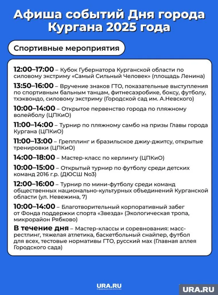 В Кургане на День города пройдут мастер-классы по бразильскому джиу-джитсу, ходьбе «Русский мах» и мас-рестлингу — национальному вид спорта Якутии. Спортивные мероприятия будут идти более чем на 10 площадках в разных частях города. Основные события развернутся на Центральной площади, ЦПКиО и Городском саду. Подробная спортивная программа праздника на 30 августа — в материале корреспондента URA.RU.