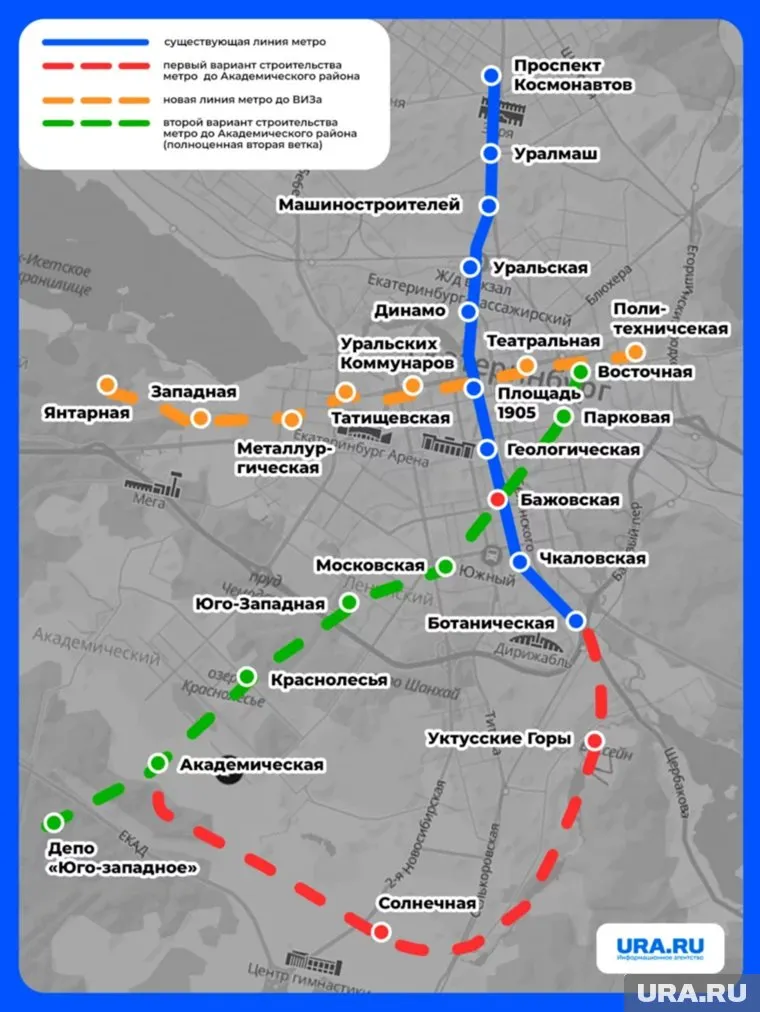 Спустя 34 года власти города и области продолжают решать вопрос о дальнейшем развитии подземного транспорта. Сейчас в Екатеринбурге есть девять станций. Летом 2024 года URA.RU сообщало, что с подачи тогдашнего губернатора Евгения Куйвашева мэр Екатеринбурга Алексей Орлов и его заместитель Рустам Галямов начали прорабатывать два сценария развития метрополитена. Согласно первому, действующие ветки планировалось пролить. Для этого нужно построить четыре новые станции — на Уктусе, в Солнечном и две в Академическом районе. Согласно второму сценарию, создать полноценную вторую линию. Идти она должна от Академического района до «Восточной». В феврале 2025 года Галямов отмечал, что проектировщики приступили к работе над тоннелями метро от Академического до Юго-Запада и Верхней Пышмы.