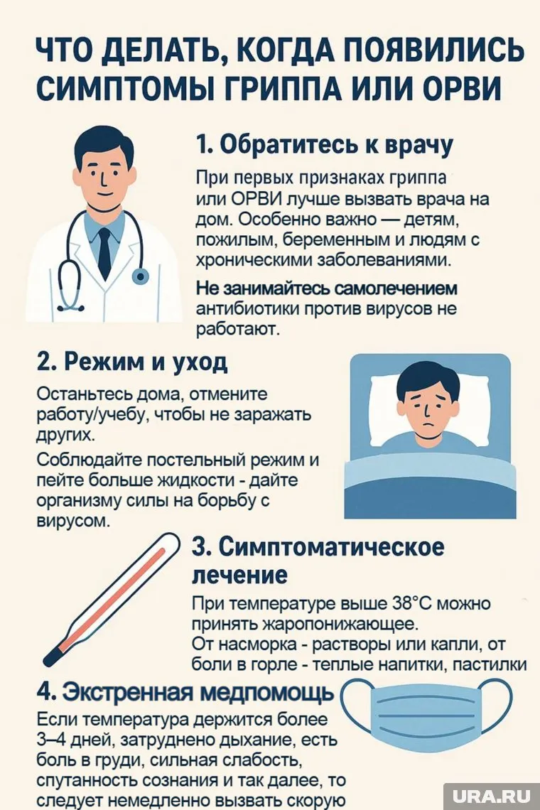 При появлении первых признаков ОРВИ или гриппа — насморка, кашля, боли в горле, слабости и температуры — необходимо немедленно вызвать врача на дом или обратиться в больницу самостоятельно. Так можно избежать осложнений и быстрее выздороветь. Особенно это важно для детей, пожилых людей, беременных женщин и пациентов с хроническими заболеваниями. При том, важно помнить: самолечение может быть опасно, а антибиотики — бесполезны, так как не работают против вирусов.