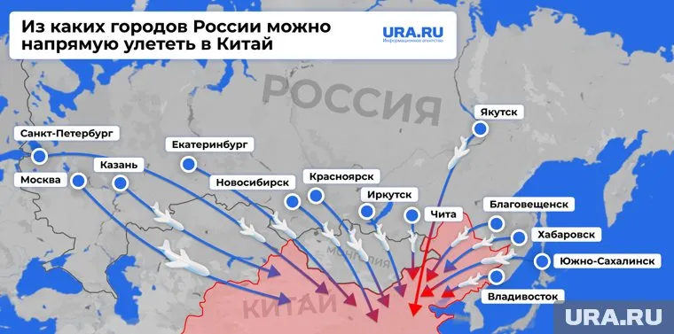 Из каких городов России можно напрямую улететь в Китай. Карта