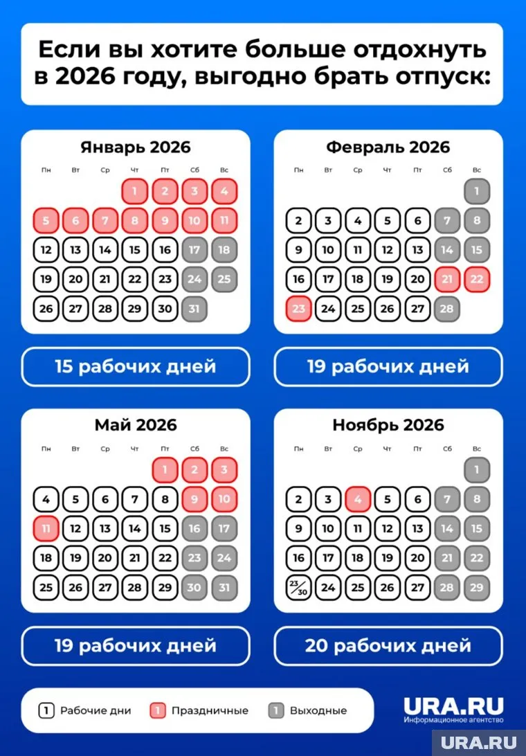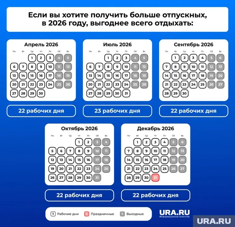 В предстоящем году эксперты советуют брать отпуск в месяцы с наибольшим числом рабочих дней — июль (23 дня), апрель, сентябрь, октябрь и декабрь (по 22 дня), чтобы получить максимальные отпускные выплаты. Меньше всего рабочих дней в январе (15), феврале и мае (по 19), что выгодно для тех, кто предпочитает длительный отдых. Подробнее — в материале URA.RU.