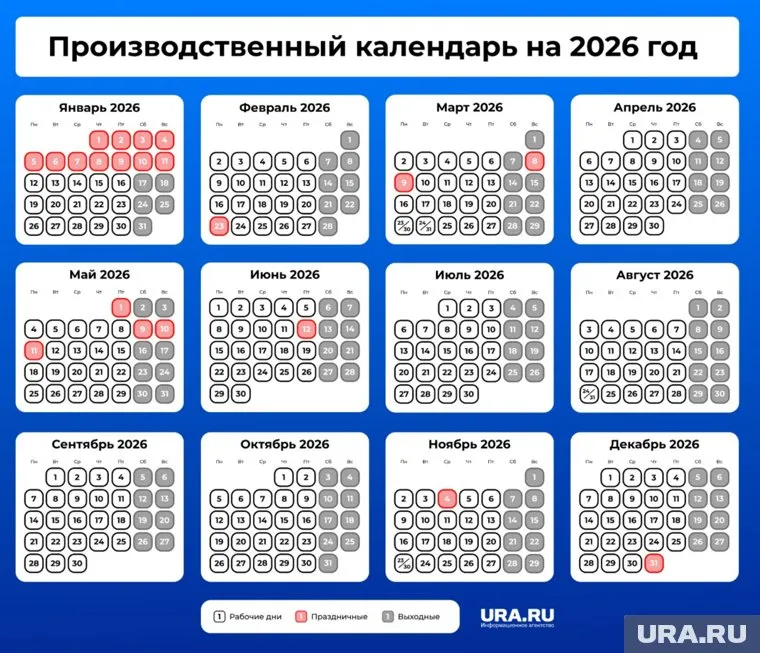 Минтруд России представил проект производственного календаря на 2026 год. Согласно документу, россиян ожидают 12-дневные новогодние каникулы и несколько длинных выходных, шестидневных рабочих недель не будет.