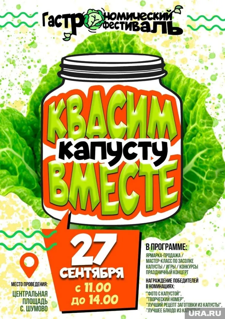 В Челябинской области 27 сентября состоится гастрономический фестиваль «Квасим капусту вместе». Мероприятие пройдет на центральной площади села Шумово Красноармейского района. Гостям предложат поучаствовать в мастер-классе по засолке капусты, продегустировать продукты и принять участие в конкурсах, сообщают в пресс-службе министерства сельского хозяйства региона.