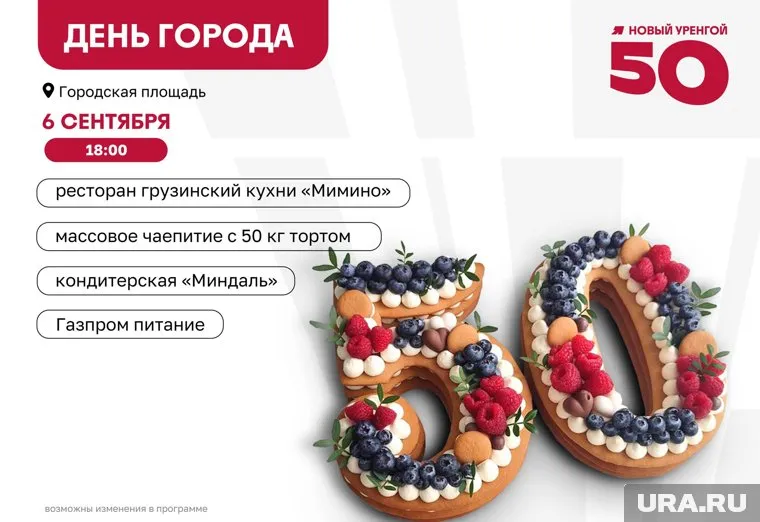 В Новом Уренгое (ЯНАО) в честь юбилея гостей праздника угостят 50-килограммовым тортом. Об этом сообщили в пресс-службе мэрии газовой столицы.