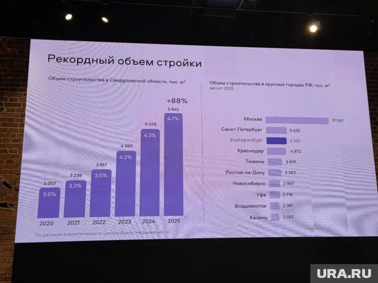 «За пять лет объем строительства в Свердловской области вырос почти в два раза, а конкретнее, на 88%. Это очень большое значение в рамках отрасли и городов», — сказала Жильцова. Общий объем строительства в регионе составляет 5,6 млн квадратных метров.
