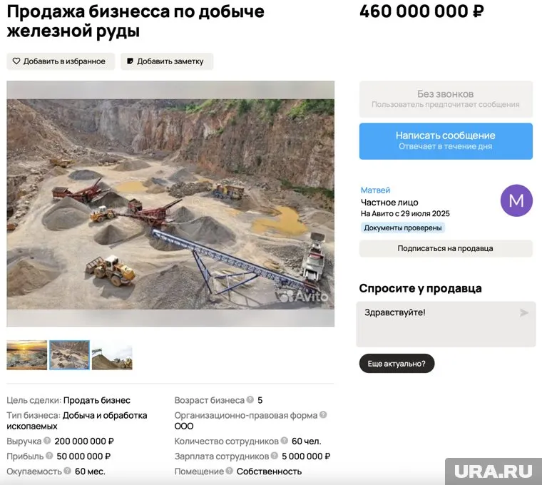 Фото: скрин сайта «Авито», https://www.avito.ru/uyskoe/gotoviy_biznes/prodazha_biznessa_po_dobyche_zheleznoy_rudy_7598998658