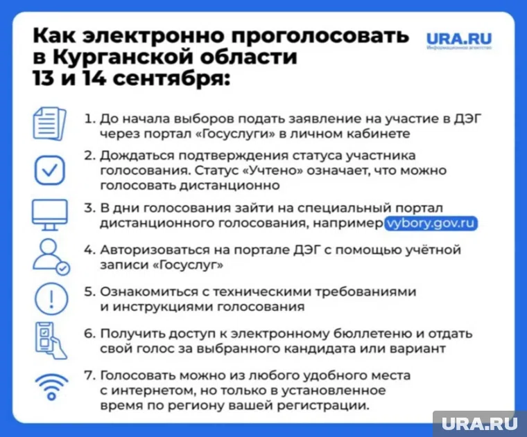 Впервые в 2025 году на выборах данного уровня жители Курганской области смогут проголосовать онлайн через систему дистанционного электронного голосования (ДЭГ). Этот формат позволяет выразить волю избирателя без бумажного бюллетеня — с помощью компьютера или смартфона, зайдя на федеральный портал vybory.gov.ru. Для участия необходима подтвержденная учетная запись на Госуслугах.