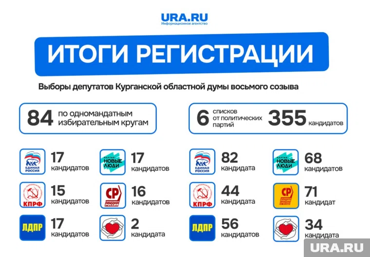Курганцам предстоит избрать 34 депутата областной Думы восьмого созыва. В гонке участвуют шесть партий, которые выдвинули в общей сложности более 350 кандидатов. Наибольший список представила «Единая Россия» (82 кандидата по спискам и 17 по округам). У ЛДПР — 73 кандидата, у КПРФ — 59, у «Справедливой России — За правду» — 87, у «Новых людей» — 85, у «Партии пенсионеров» — 36.
