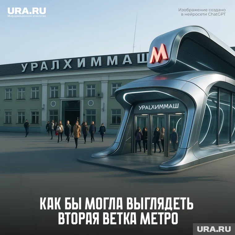 Нейросеть предположила, что к 2125 году в городе проложат вторую ветку метро. Одну из новых станций, предположил искусственный интеллект, назовут «Уралхиммаш». Судя по изображению, вход на станцию выполнят из металла, а огромные окна будут уходить в пол. В целом, входная группа скорее напоминает космический корабль, чем простой спуск к вагонам.