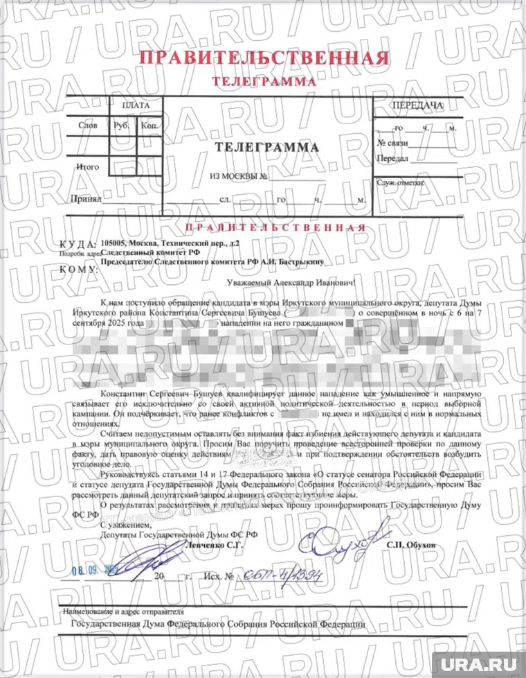 «Буквально вчера вечером было совершено нападение на нашего кандидата в мэры Иркутского района Бушуева. Он очень серьезно пострадал. Ему пришлось накладывать швы», — заявил Левченко. Заявление направлено председателю СК Бастрыкину.