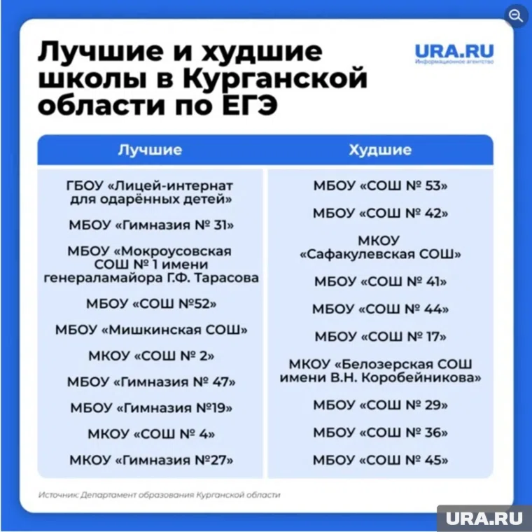 Департамент образования Курганской области опубликовал свежий антирейтинг школ региона по итогам ЕГЭ 2025 года. Худшими учебными заведениями стали пять школ в Кургане. Подробности — в материале URA.RU.