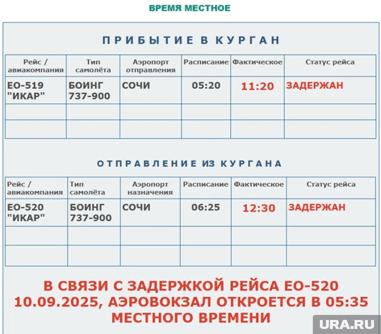 Рейс 519 из Сочи в Курган авиакомпании Икар задерживается и ожидается в аэропорту до 07:30 по местному времени, а вылет рейса 520 из Кургана в Сочи перенесен на 08:35. Об этом сообщается на онлайн-табло аэропорта утром 10 сентября.