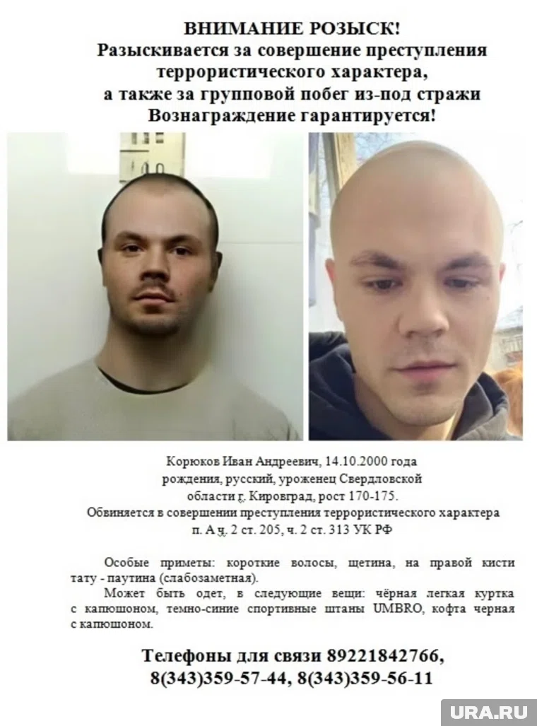 Как писало URA.RU, побег произошел в ночь на 1 сентября. Его совершили два друга Александр Черепанов и Иван Корюков (внесены в список террористов и экстремистов Росфинмониторинга). В 2023-м их задержали за попытку совершить поджог военкомата. За это военный суд приговорил парней к длительным тюремным срокам. В изоляторе они ожидали этапирования, но смогли сбежать.