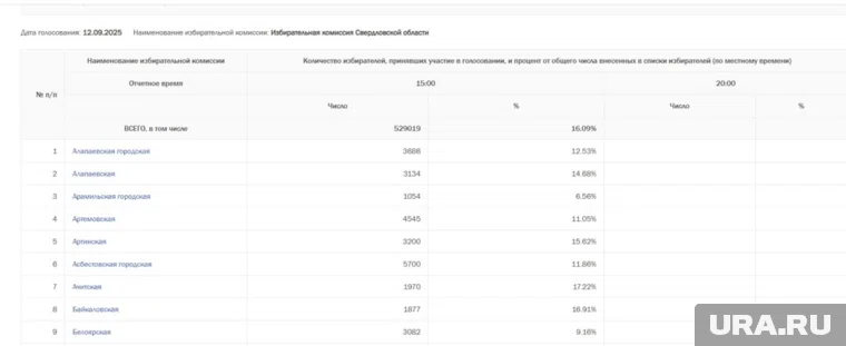 16:11 В лидерах по явке среди населенных пунктов области: Свободный — 34,4%, Таборы — 30,7%. Наименьшая явка зафиксирована в Арамиле — 6,5%, Первоуральске — 7,7% и Дегтярске — 7,9%.