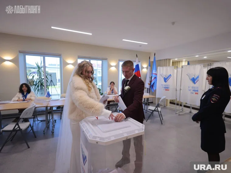 17:35 Молодожены из Лабытнанги сразу после свадьбы отправились на избирательный участок. «Мы счастливы начать семейную жизнь с участия в выборах — это наш вклад в будущее Ямала», — поделились молодые.