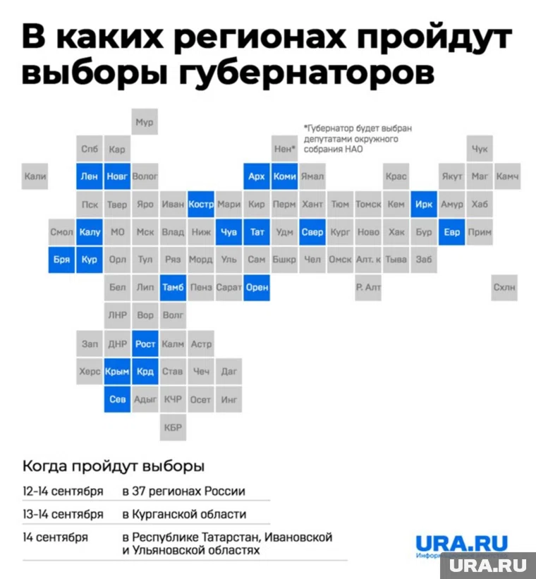С 12 по 14 сентября 2025 года в России проходит Единый день голосования (ЕДГ-2025), в рамках которого проходят региональные и муниципальные выборы. В 20 субъектах, включая Татарстан, Чувашию, Севастополь, Краснодарский край и Свердловскую область, избирают губернаторов напрямую. В Ненецком АО главу региона выбирают депутаты окружного собрания.
