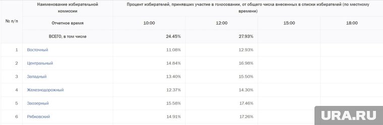 17:07 Самые высокие показатели зафиксированы в Притобольном округе — проголосовало 27,87% избирателей (10 019 человек). В тройку лидеров вошли Варгашинский — 25,22% (9 705 избирателей) и Шумихинский — 23,13% (7 569 человек). Активно голосуют также в Макушинском (22,10%, 7 644 проголосовавших), Куртамышском (21,87%, 7 207 избирателей) и Каргапольском (20,03%, 6 832 человек). Ближе к среднеобластному уровню — Катайский (19,88%, 7 293 избирателей) и Щучанский (18,65%, 5 811 человек проголосовавших).