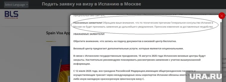 Консульство Испании в Москве приостановило прием заявок на визы от россиян. Скрин