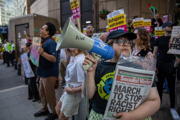 В этот же момент на площади Рассела стартовал контрмитинг движения Stand Up To Racism (Дадим отпор расизму). Там собрались сотни людей с плакатами «Беженцы приветствуются» и «Разгромим крайне правых». Среди участников были депутат Дайан Эбботт, активистка Сэбби Дхалу и писательница Луиза Роу, которые обвиняли правых в разжигании ненависти и в опасной риторике против мигрантов.