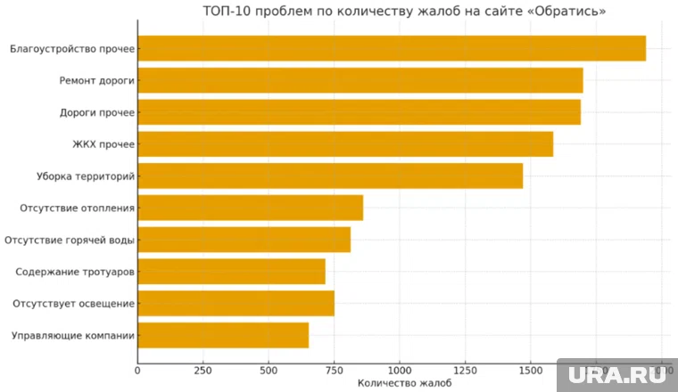 Кроме того, согласно статистике, жители Кургана часто выражают недовольство по вопросам ЖКХ (1586 жалоб), уборки территорий (1470) и отсутствия отопления (861). В число распространенных проблем также вошли отсутствие горячей воды, недостаточное освещение улиц, плохое состояние тротуаров и работа управляющих компаний.