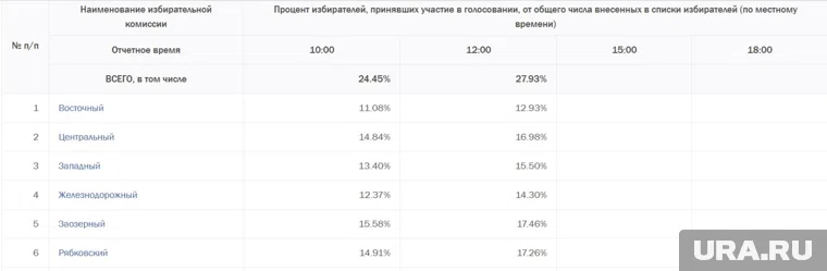 «Лидером по явке пока остается Заозерный — 17,46%. Ему составит конкуренцию может Рябковский –17,26%. В Восточном округе явка составляет 12,93%, в Центральном — 16,98%, в Западном — 15,5%», — содержится в данных избиркома.