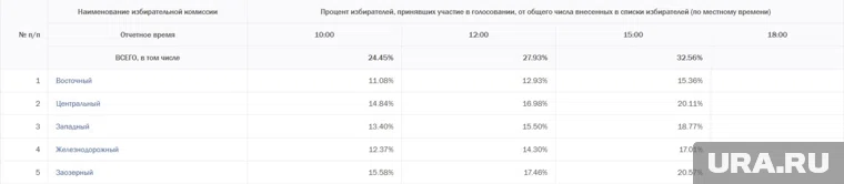 «Лидеры по явке на 15:00 14 сентября в Кургане: Заозерный (20,57%), Рябковский (20,33%) и Центральный (20,11%). У Западного — 18, 77%. Меньше всех у Восточного и Железнодорожного — 15,36% и 17,01% соответственно», — содержится в данных облизбиркома.