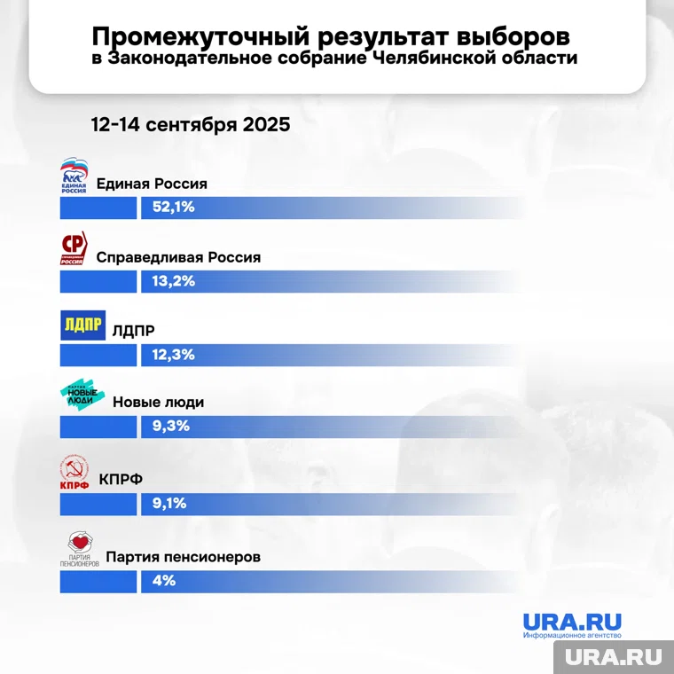 «По предварительным данным, применительно к 30 приходящимся на партийные избирательные списки мандатов единороссы получают 52,1% голосов. Ближайшие соперники в лице „Справедливой России“ набирают 13,2%. Далее следуют ЛДПР (12,3%), „Новые люди“ (9,3%), КПРФ (9,1%) и Партия пенсионеров — 4%», — рассказал URA.RU директор Центра Антон Громыко.