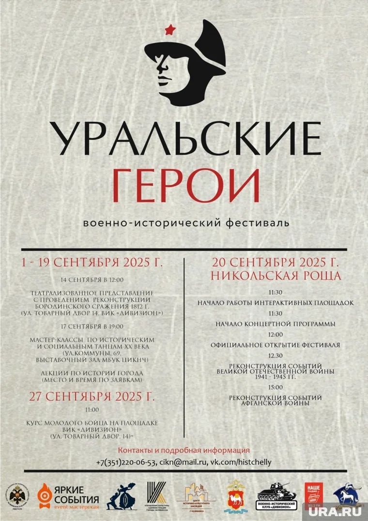«20 сентября в 11:30 Центр историко-культурного наследия города Челябинска приглашает на Военно-исторический фестиваль „Уральские герои“. В рамках фестиваля запланировано проведение исторических реконструкций, посвященных событиям Великой Отечественной войны (1941 — 1945 гг.) и Афганской войны», — отметили в пресс-службе комитета.