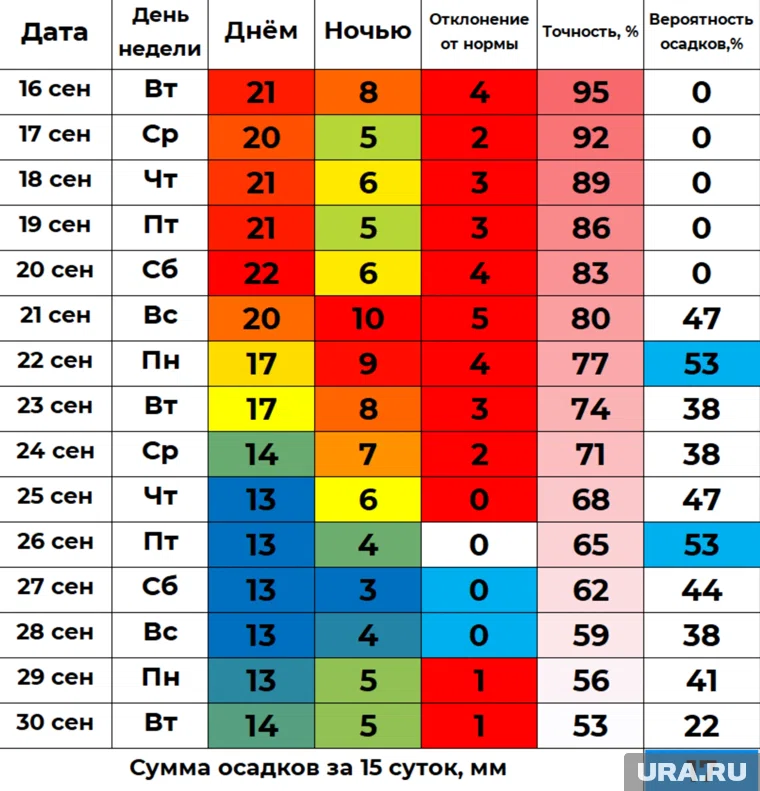 «С 16 по 30 сентября в Кургане ожидается средняя температура около 11 градусов, что на 2 градуса выше климатической нормы. В период с 16 по 23 сентября днем воздух будет прогреваться до 17…22, а ночью температура составит 5…10 градусов», — сообщает telegram-канал «Погода 45».
