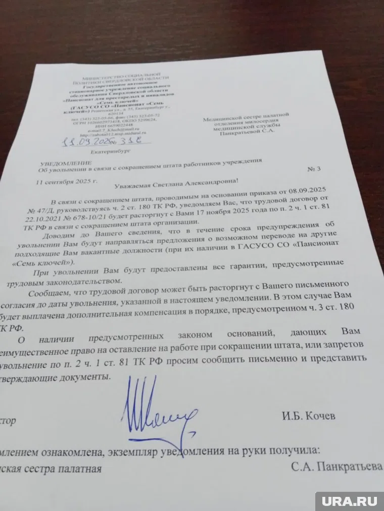 «В связи с сокращением штата, уведомляем вас, что трудовой договор будет расторгнут с вами 17 ноября 2025 года», — говорится в документе. Там же указано, что до момента увольнения организация будет предлагать сотрудникам, попавшим под сокращение, другие вакантные должности в пансионате в случае их наличия.