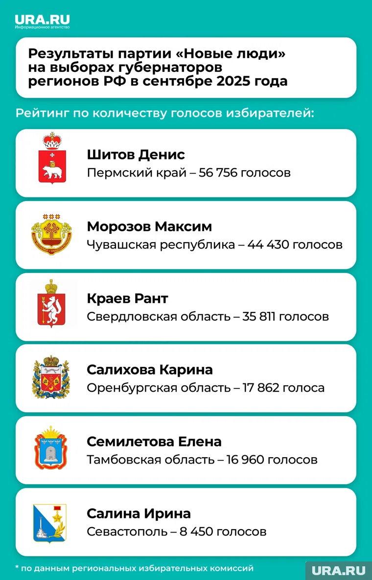 Всего в России состоялись 20 губернаторских кампаний, в которых участвовали шесть кандидатов от «Новых людей: в Пермском крае, Свердловской области, Оренбургской области, Тамбовской области, Чувашской республике и Севастополе. Рейтинг кандидатов от партии „Новые люди“ по процентам, полученным в регионах, вывел Дениса Шитова на второе место. Первое занял Максим Морозов из Чувашии — 8,37%, Денис Шитов из Прикамья на втором месте — 5,87%.
