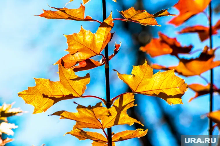 Оранжевые листья клена осенью, говорят о теплой зиме