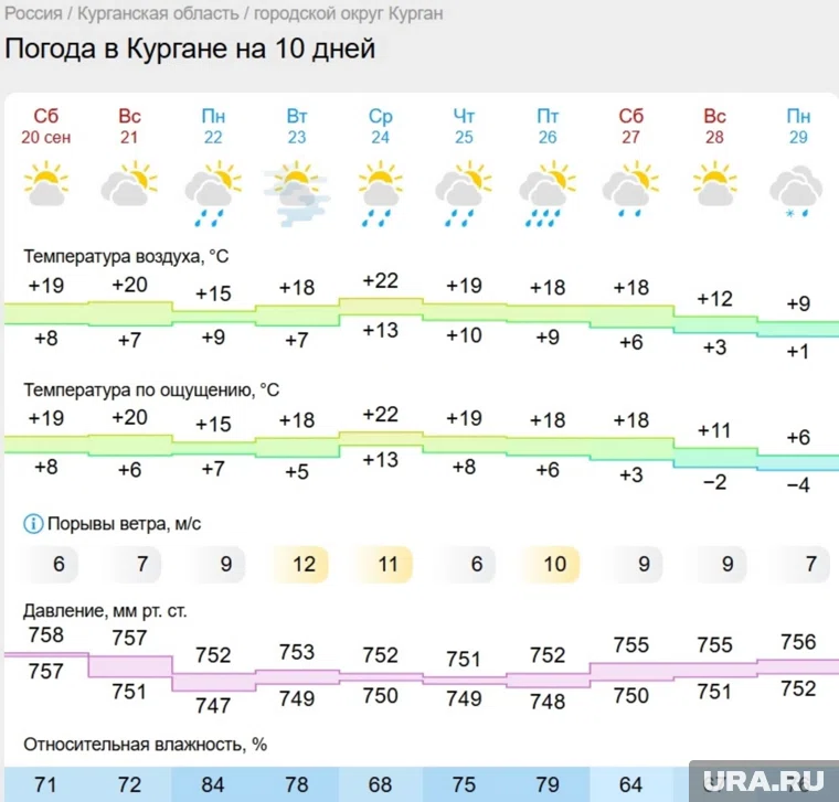 Несмотря на сырую погоду, тепло сохранится. Температура воздуха в дневное время будет около 18-22 градусов в Кургане, в Шадринске чуть прохладнее — около 15-20. Вместе с дождями в регион придут сильные ветра до 10-14 м/с.