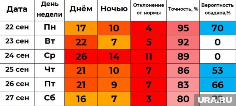 «В среду, 24 сентября, в Кургане ожидается потепление до 26 градусов. Это выше нормы на 11 градусов. В ночное время будет около 14», — сообщает синоптик-любитель Илья Винштейн в своем telegram-канале «Погода 45 — погода в Кургане».