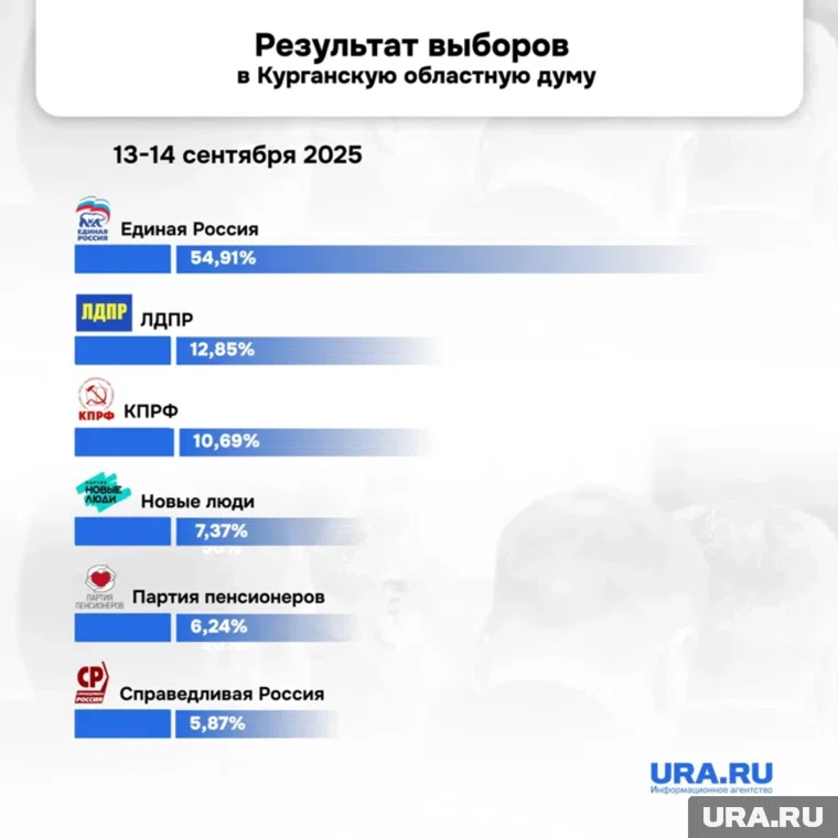 Выборы в Курганскую областную думу завершились убедительной победой «Единой России», которая значительно укрепила свои позиции. Партия власти набрала почти 55% голосов по спискам и забрала все 17 одномандатных округов, что в итоге обеспечило ей беспрецедентные 29 из 34 мандатов. Явка превысила 38% — заметно выше, чем в предыдущие годы, что эксперты связывают с двухдневным форматом и внедрением дистанционного электронного голосования (ДЭГ).