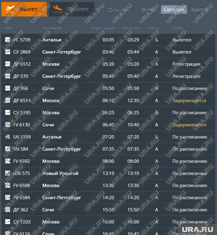 «Рейс FV 6130 Пермь — Сочи авиакомпании „Россия“, который ранее планировали отправить в 08:40, теперь вылетит только в 10:40 — задержка увеличилась еще на два часа. Посадка начнется в 10:00. Рейс ДР 365 Сочи — Пермь авиакомпании „Победа“, прибытие которого ожидали в 05:41, теперь прибудет только в 11:45 — задержка увеличилась еще на 6 часов четыре минуты», — указано в онлайн-табло пермского аэропорта.