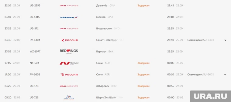 В екатеринбургском аэропорту Кольцово вечером 22 сентября перенесли рейсы авиакомпаний «Уральские авиалинии», «Россия», Nordwind и Universal Airlines. Информация об этом появилась на онлайн-табло авиагавани.