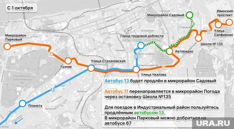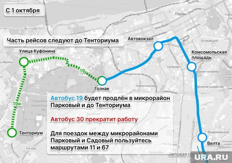 В Перми с 1 октября ряд автобусов будет ходить по обновленным маршрутам. Изменения коснутся автобусов №11, 13, 19 и 30. Об этом сказано в telegram-канале департамента транспорта.