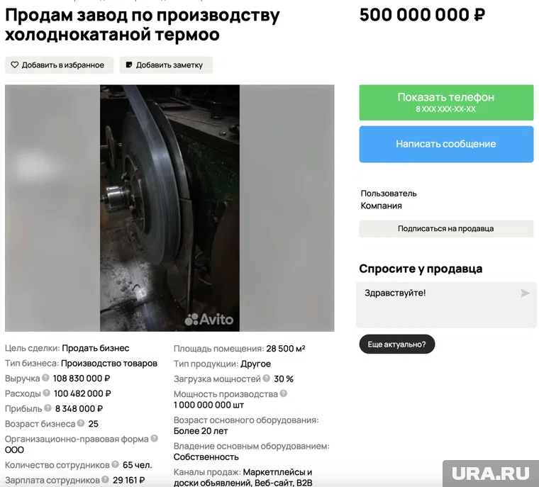 Фото: скрин сайта «Авито», https://www.avito.ru/minyar/gotoviy_biznes/prodam_zavod_po_proizvodstvu_holodnokatanoy_termoo_7638567062