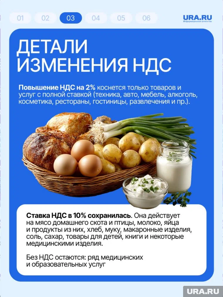 Уточняется, что повышение НДС не затронет социально значимые товары, для которых действует пониженная ставка. Для продукции, включающей мясо, молоко, яйца, хлеб, муку, макаронные изделия, соль, сахар и ряд других категорий, сохранится ставка 10%. Она также продолжит применяться к товарам для детей, книжной продукции, лекарственным препаратам и отдельным медицинским изделиям.
