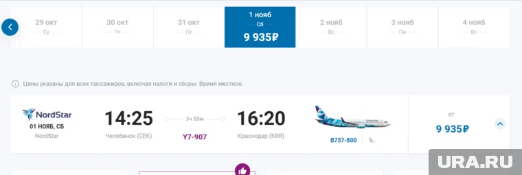 В авиакомпании URA.RU уточнили, что первый рейс из Челябинска в Краснодар отправится 1 ноября в 14 часов 25 минут. Билеты уже можно купить на 1, 8, 15 ноября и 27 декабря. Стоимость самых дешевых — 9935 рублей без багажа. Время в пути — три часа 55 минут.