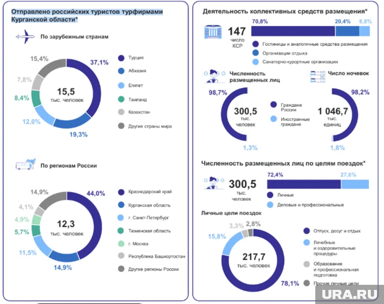 «Отправлено российских туристов турфирмами Курганской области по зарубежным странам: Турция (37,1%), Абхазия (19,3%), Египет (12%), Таиланд (8,4%), Казахстан (7,85%) и другие страны (15,4%)», — рассказали нам. Внутри России курганцы предпочитали путешествовать по Краснодарскому краю (44%), Курганской области (14,9%), Санкт-Петербургу (11,5%) и Москве (4,9%).